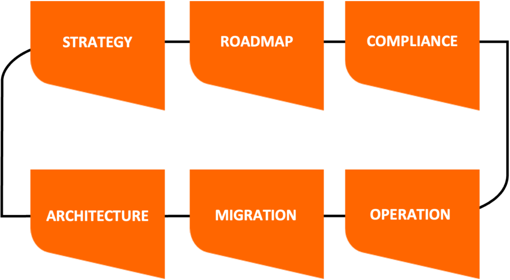 Úspěch Cloud Journey závisí na zvládnutí následujících šesti oblastí. Při jejich přizpůsobení vašim potřebám vycházíme z hlubokých zkušeností s on-premise IT, s technologiemi Azure, AWS, Oracle či Google a z jejich cloud frameworků.
