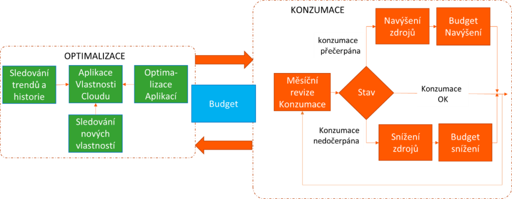 Následující diagram vytvořili Lukáš Klášterský, Zdeněk Mach a jejich kolegové z Governance týmu (kteří vám rádi pomohou nejen v oblasti cloud strategií). Jeho stěžejní myšlenkou je budget, tedy odhad nákladů na provoz infrastruktury za dané období.