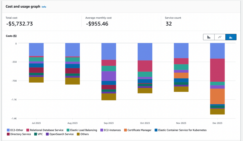 Výstup z AWS Costs Explorer, na kterém je hezky vidět, že v prosinci 2023 došlo ke značnému navýšení konzumace služeb Relational Database Service (tedy platformní databáze) a Certificate Manager.
