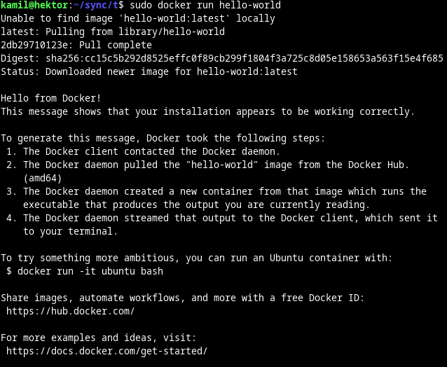 Asi nejjednodušší myslitelný kontejner se jmenuje hello-world a je ke stažení na Docker Hubu. Pokud máte nainstalovaný Docker, můžete si tento kontejner spustit jediným příkazem: docker run hello-world: