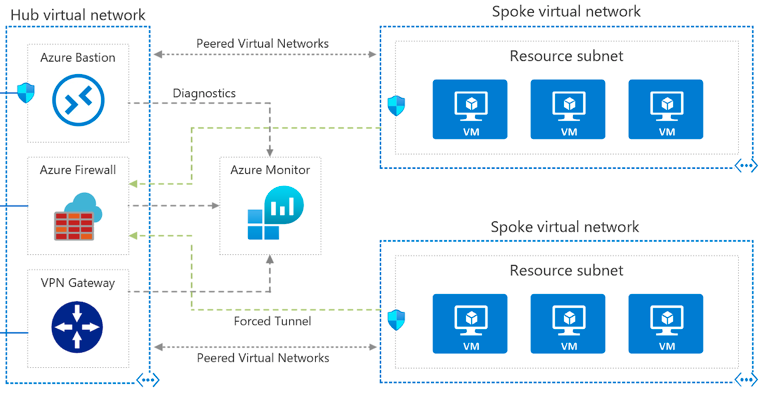 Zdroj: https://docs.microsoft.com/en-us/azure/architecture/reference-architectures/hybrid-networking/hub-spoke?tabs=cli