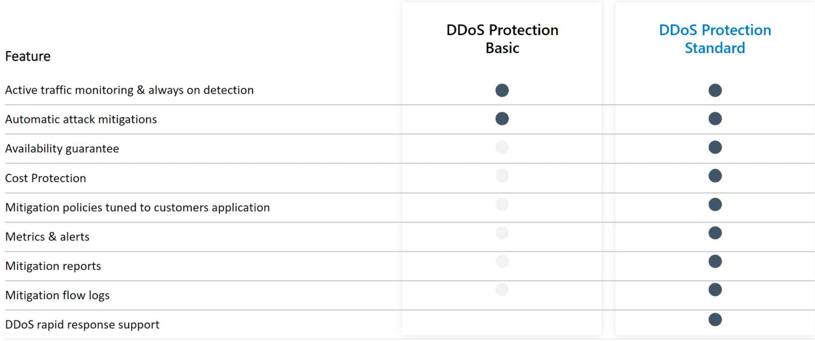 Všechny Azure i AWS zdroje jsou chráněny základní DDoS ochranou, která je zdarma a bez nutnosti konfigurace. V Azure je to DDoS Basic, v AWS Shield Standard. Dále existují placené varianty – v Azure DDoS Standard a v AWS Shield Advanced. Placené varianty nepatří mezi nejlevnější služby, ale přinášejí oproti základnímu plánu některé přidané funkcionality – viz následující obrázek.