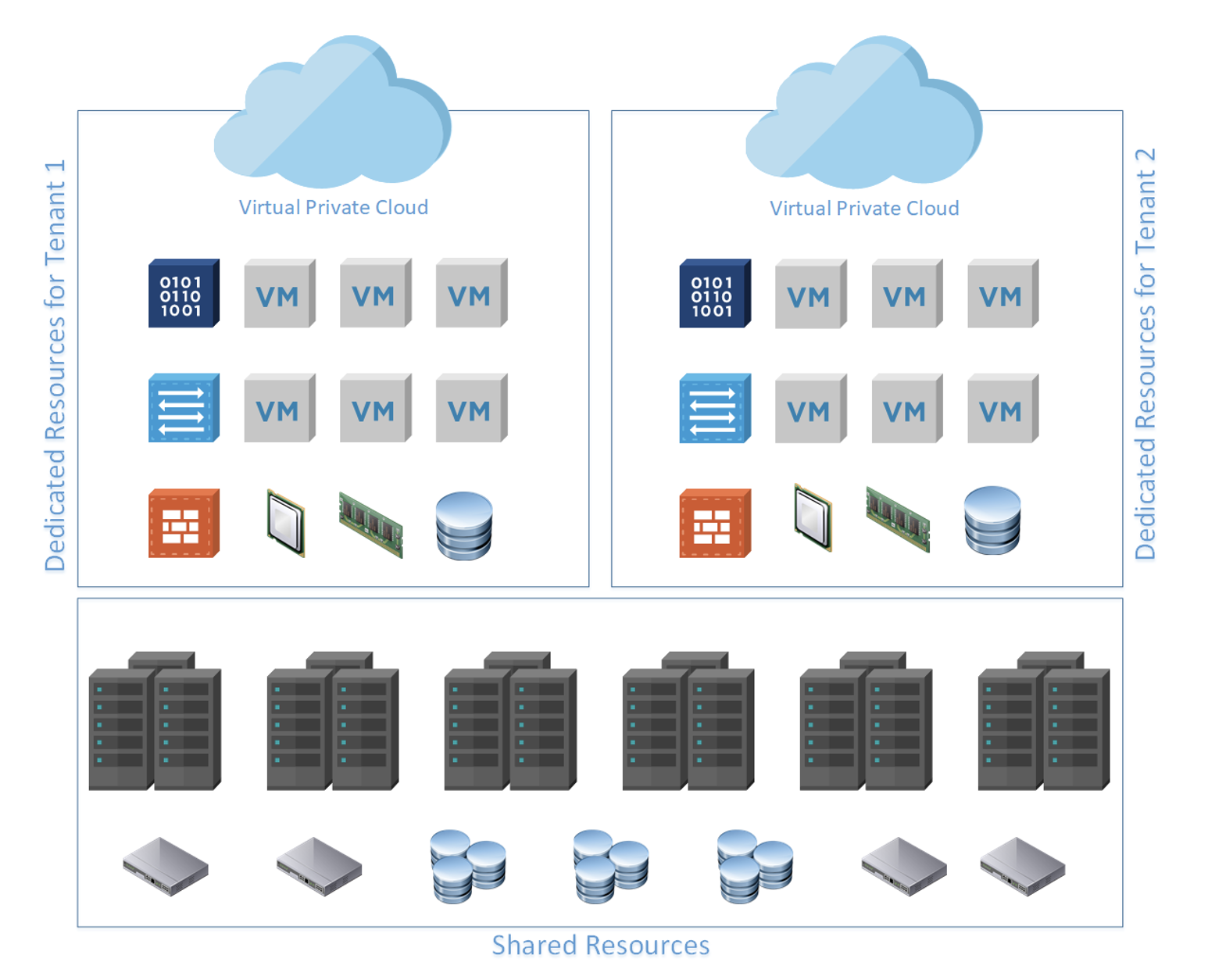 - Virtual private cloud – hardware a virtualizace se schopnostmi cloudu, jedna hardware infrastruktura sdílený několika zákazníkům